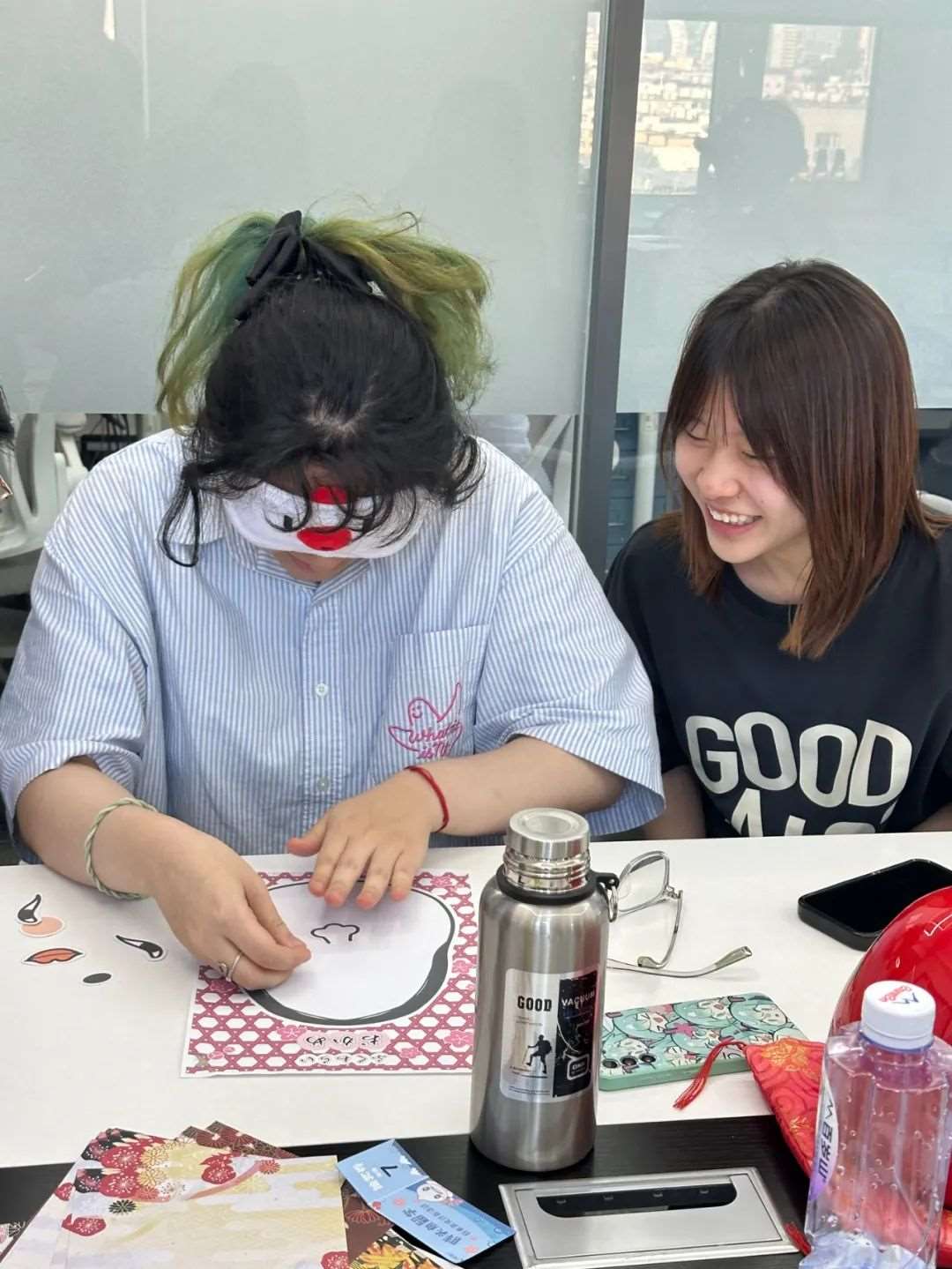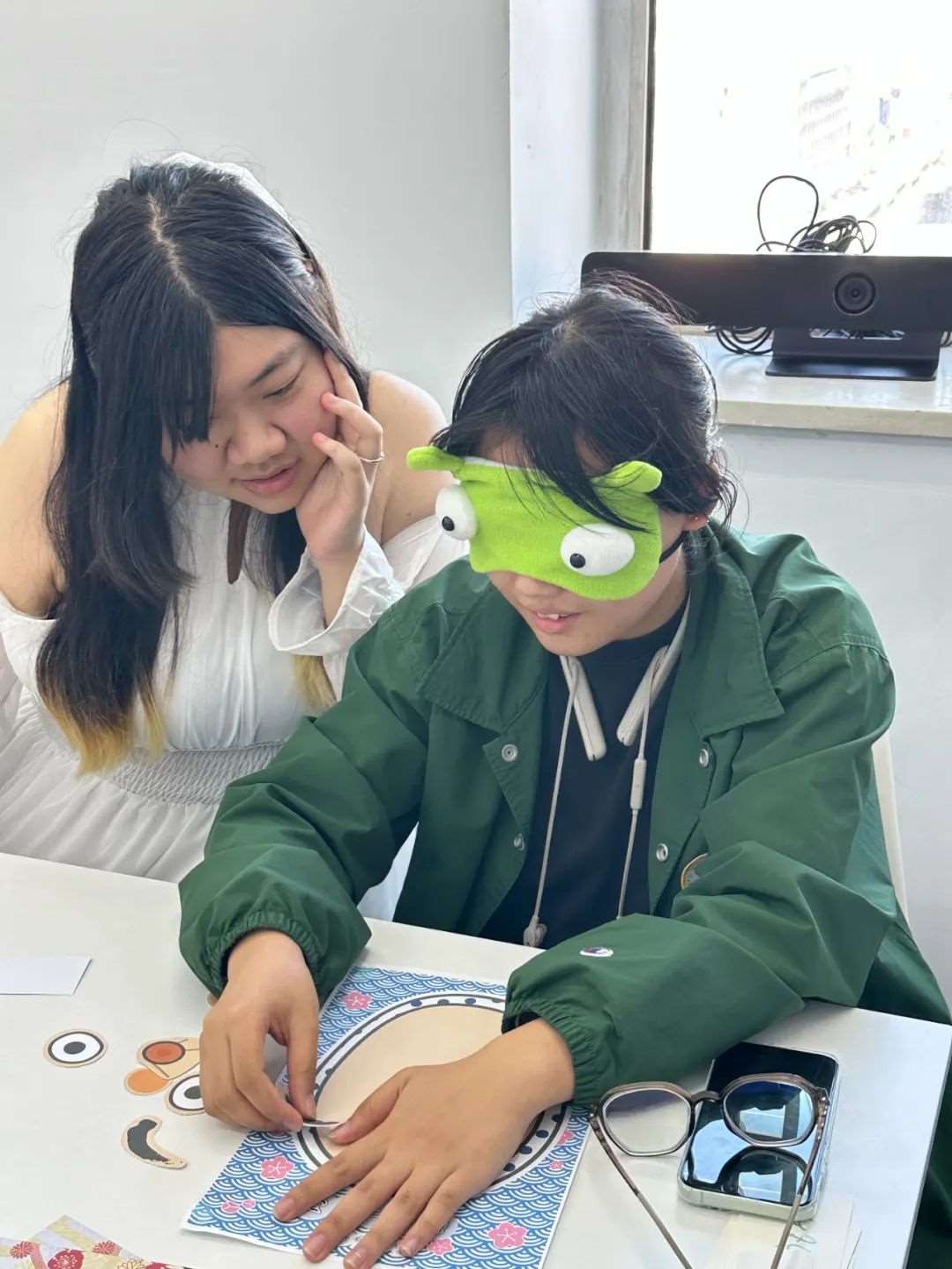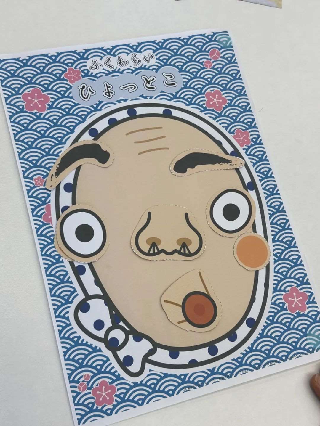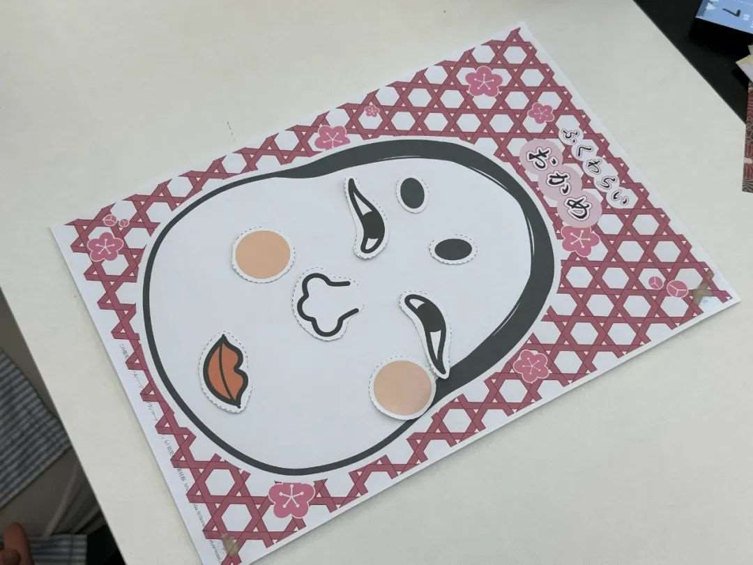 1.道具准备:超大“福笑”(日式面具)画板、可粘贴的五官贴纸、眼罩。