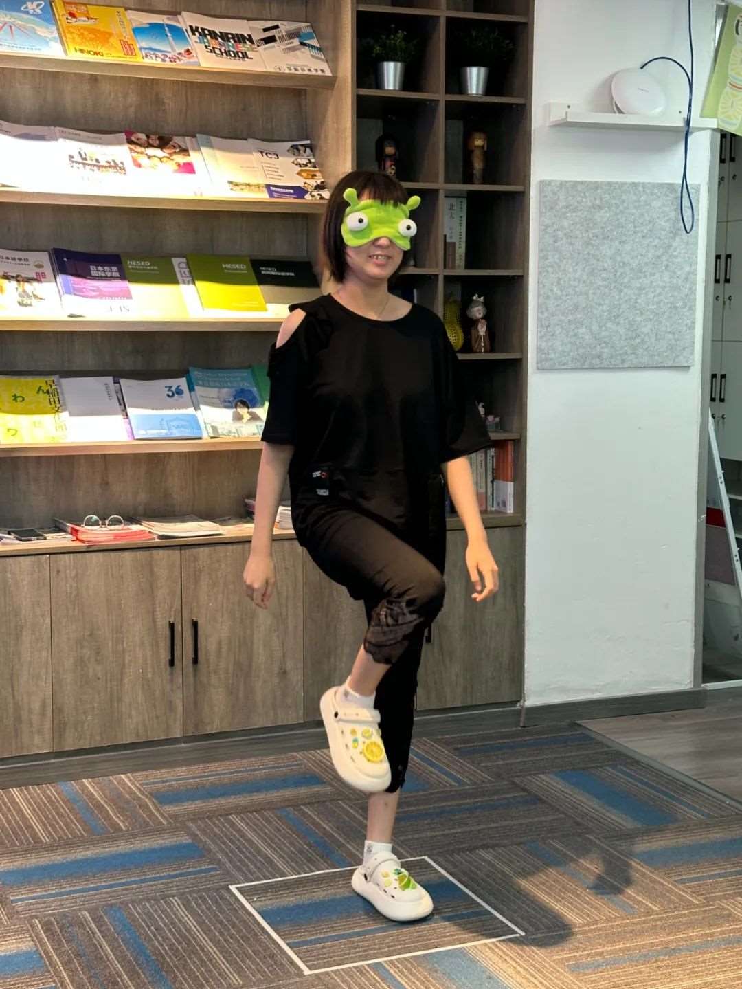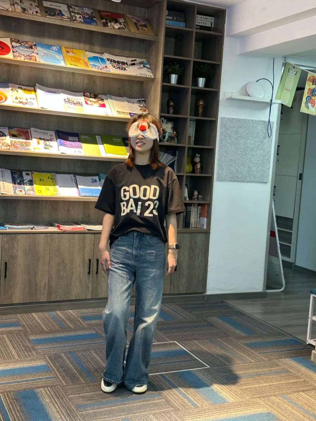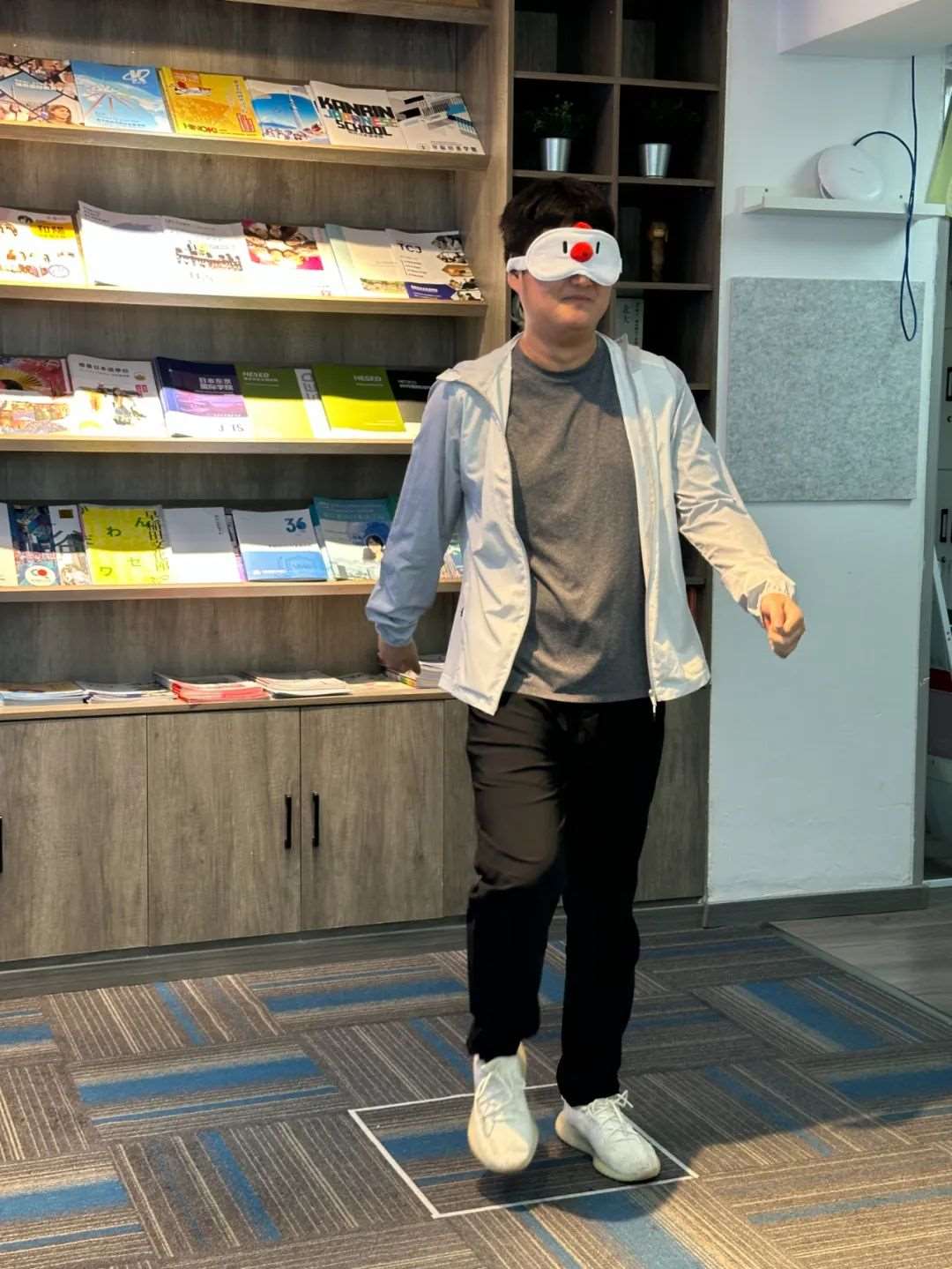 1.道具准备:超大“福笑”(日式面具)画板、可粘贴的五官贴纸、眼罩。