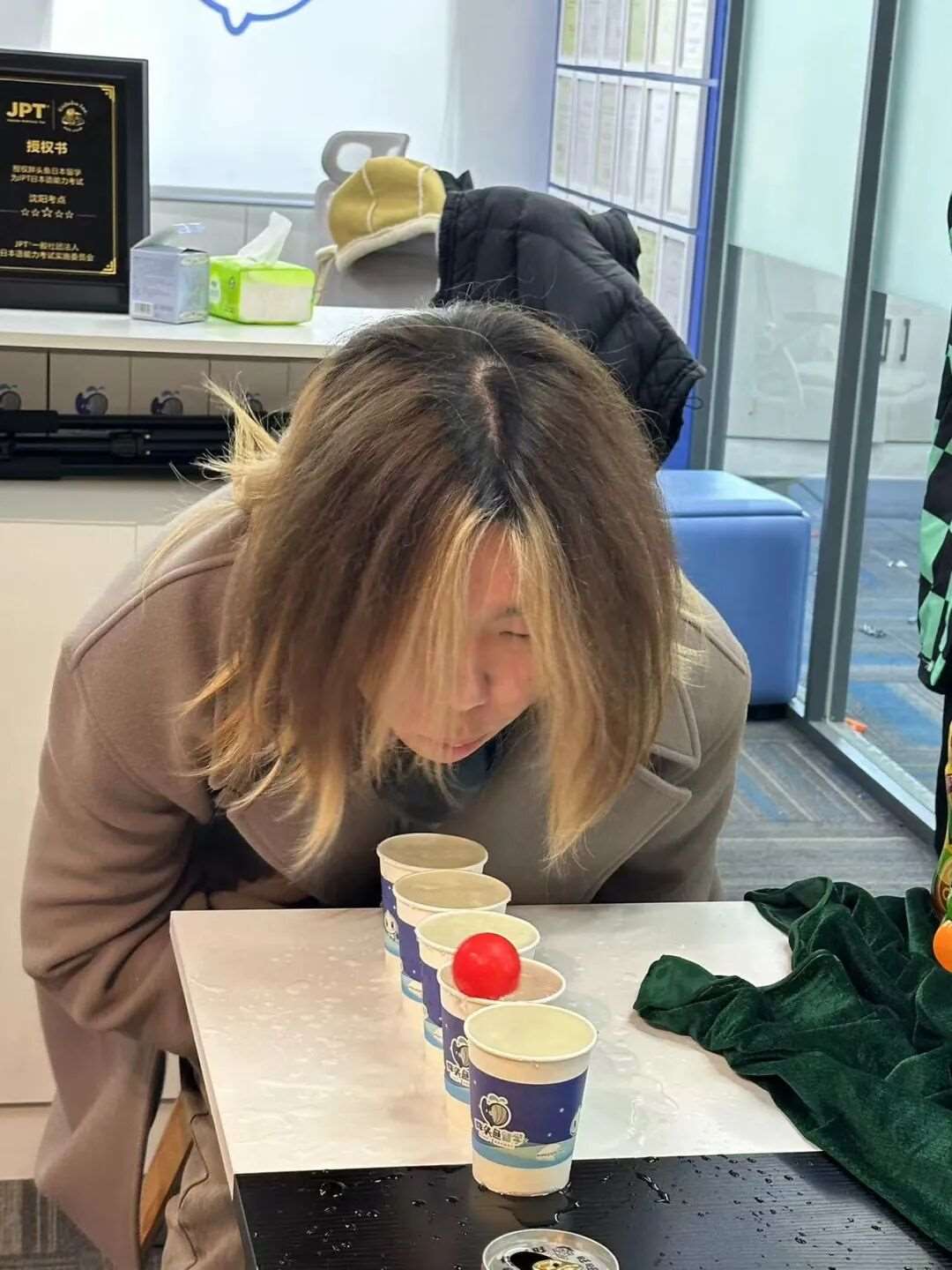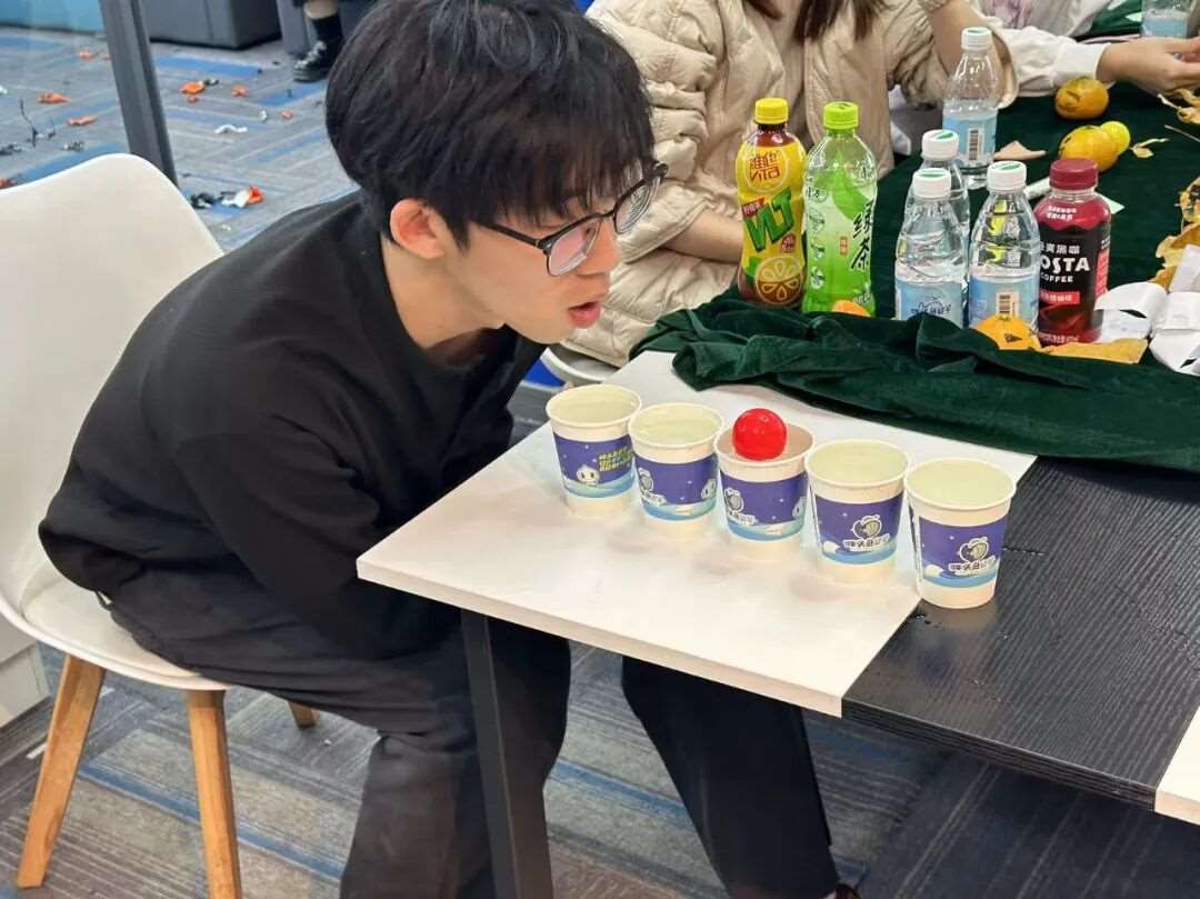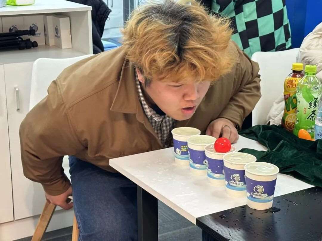 桌面上5个装满水的水杯排成一列,队员需用嘴吹动乒乓球依次通过。看似简单的玩法,实则考验肺活量与稳定性——乒乓球中途掉落就要重新开始,现场既有因一次成功而欢呼的时刻,也有因反复掉落而笑作一团的场景,“康师傅绿茶”组队员稳住节奏,以*短时间完成挑战,将比分优势扩大到3:0。